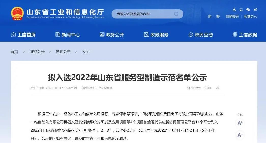 根據(jù)工作安排,經(jīng)各市工業(yè)和信息化局推薦,專家評(píng)審等環(huán)節(jié),擬將萊蕪鋼鐵集團(tuán)電子有限公司等76家企業(yè)、山東一唯自動(dòng)化有限公司機(jī)器人智能焊接系統(tǒng)的研發(fā)及應(yīng)用項(xiàng)目等4個(gè)項(xiàng)目和金現(xiàn)代供應(yīng)鏈協(xié)同管理云平臺(tái)11個(gè)平臺(tái)列入2022年山東省服務(wù)型制造示范。