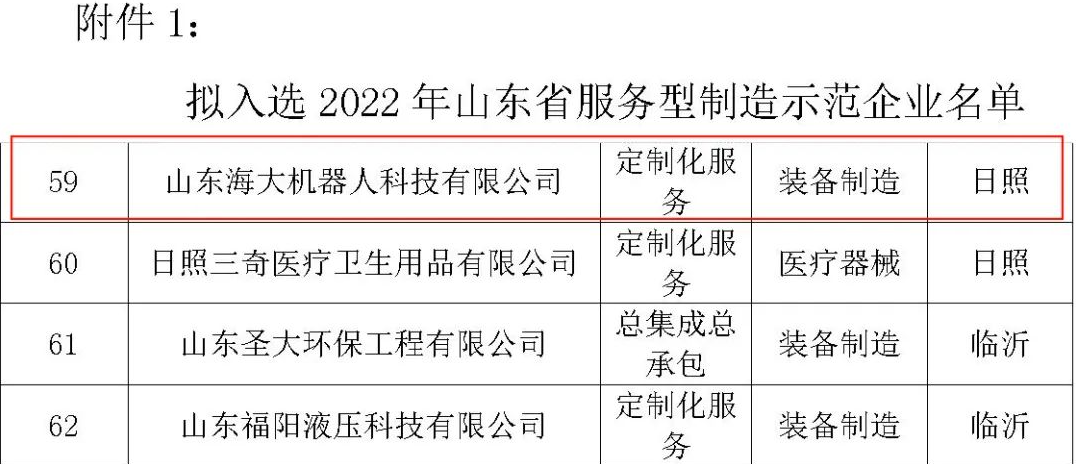 10月17日,山東省工業(yè)和信息化廳對(duì)擬入選2022年山東省服務(wù)型制造示范名單進(jìn)行公示,山東海大機(jī)器人入選示范企業(yè)類榜單!