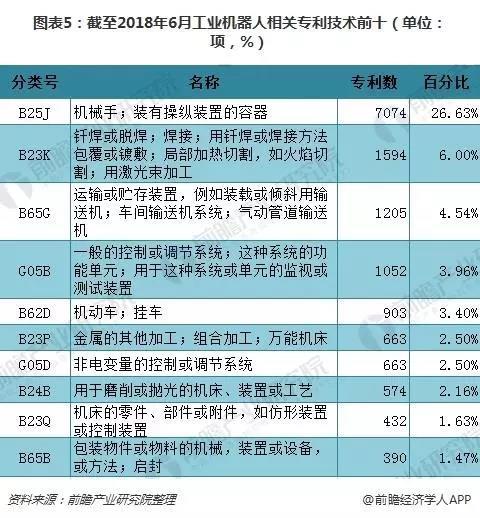 截至2018年6月,從我國(guó)工業(yè)機(jī)器人專利技術(shù)構(gòu)成來(lái)看,B25J(機(jī)械手;裝有操縱裝置的容器)專利申請(qǐng)數(shù)量排名第一,為7074項(xiàng),占比達(dá)到26.63%;B23K(釬焊或脫焊;焊接;用釬焊或焊接方法包覆或鍍敷;局部加熱切割,如火焰切割;用激光束加工)專利申請(qǐng)數(shù)排名第二,專利數(shù)量為1594項(xiàng),占比為6.00%;其余技術(shù)占比均在5%以下。
