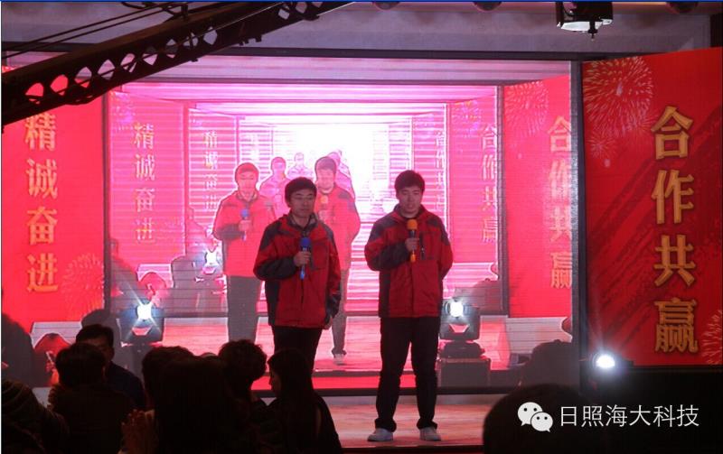 活動(dòng)現(xiàn)場(chǎng)充滿了激情、熱烈、活躍的氣氛。在晚會(huì)正式開始前,一段精心制作的視頻在舞臺(tái)屏幕上靜靜播放,視頻展現(xiàn)了2014年公司發(fā)展大事記,記錄了每一位公司員工的點(diǎn)滴汗水凝聚成的一項(xiàng)項(xiàng)輝煌的成績(jī)。然后,公司總經(jīng)理田洪芳先生致辭,田總說:“在過去一年里,山東海大機(jī)器人科技限公司克服了很多困難,實(shí)現(xiàn)了很多目標(biāo)。2014年公司研發(fā)的基于物聯(lián)網(wǎng)技術(shù)的成產(chǎn)效率提升系統(tǒng)(OEE)獲得了日照市科技進(jìn)步一等獎(jiǎng),公司還承擔(dān)了2014年山東省自主創(chuàng)新及成果轉(zhuǎn)化專項(xiàng)項(xiàng)目,今后我們要構(gòu)建更優(yōu)良的平臺(tái)、發(fā)掘更好的項(xiàng)目,向更高的目標(biāo)前進(jìn)。希望公司上下團(tuán)結(jié)一致,拿出激情和干勁,為日照海大的未來奮斗!”