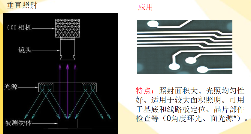 由光源構(gòu)成的照明系統(tǒng)按其照射方法可分為:背向照明、前向照明、結(jié)構(gòu)光和頻閃光照明等。其中,背向照明是被測物放在光源和相機(jī)之間,它的優(yōu)點(diǎn)是能獲得高對比度的圖像,LED面光源和平行光源是這樣使用的,用來突出產(chǎn)品的輪廓,比如工件的尺寸測量就是使用這種方法。前向照明是光源和相機(jī)位于被測物的同側(cè),這種方式便于安裝,比如條形光源,同軸光源,環(huán)形光源,圓頂光源,線光源等都是使用這樣的用法,這是最常用的照明方式。結(jié)構(gòu)光照明是將光柵或線光源等投射到被測物上,根據(jù)它們產(chǎn)生的畸變,解調(diào)出被測物的三維信息,這種方式比較少見。頻閃光照明是將高頻率的光脈沖照射到物體上,要求相機(jī)的掃描速度與光源的頻閃速度同步,目前頻閃照明方式一般都使用光源的控制器控制光源達(dá)到頻閃的功能,頻閃的工作方式可以大大提高光源的亮度和壽命,幾乎所有的LED光源都可以使用頻閃照明方式。