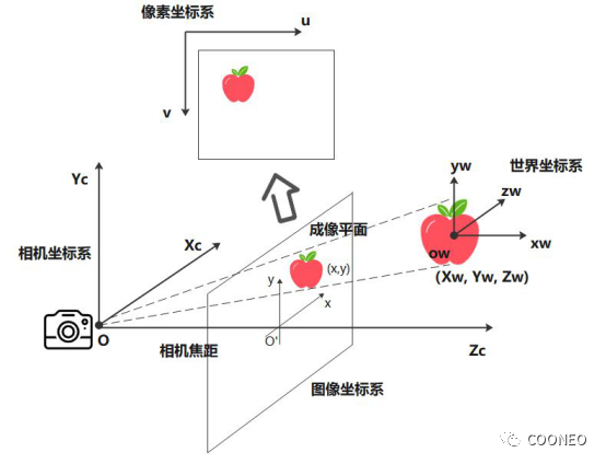 3、相機坐標系(Xc,Yc,Zc):相機光心點為O,X軸和Y軸與圖像平面坐標系的x軸和y軸平行,Z軸為相機的光軸,和成像平面垂直。光軸與圖像平面的交點為圖像主點O',由點O與軸組成的直角坐標系稱為相機坐標系。OO'為相機焦距。