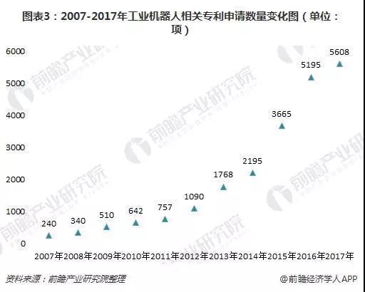 從申請專利數(shù)量來看,2007-2017年,我國工業(yè)機器人專利申請數(shù)量總體上呈上升的趨勢。2014-2016三年間,專利申請數(shù)量大幅增多;到2017年,工業(yè)機器人專利申請數(shù)量達到5608項。