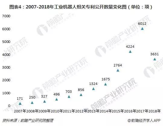 從公開專利數(shù)量來看,2007-2017年,我國工業(yè)機器人專利公開數(shù)量總體上呈趨勢。2017年,我國工業(yè)機器人專利公開數(shù)量為6012項,達到近年來最大值;截至2018年6月,專利公開數(shù)量為3631項。