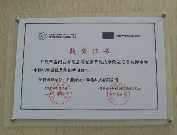 2011年10月13日在京舉行的中國電機(jī)系統(tǒng)節(jié)能頒獎典禮及技術(shù)研討會上我公司的日照華泰紙業(yè)有限公司變頻節(jié)能技術(shù)改造項目被中國標(biāo)準(zhǔn)化研究院和中國節(jié)能協(xié)會節(jié)能服務(wù)產(chǎn)業(yè)委員會評審為“中國機(jī)電系統(tǒng)節(jié)能優(yōu)秀項目”。為推動電機(jī)系統(tǒng)節(jié)能工程的實施,由中國標(biāo)準(zhǔn)化研究院、中國節(jié)能協(xié)會節(jié)能服務(wù)產(chǎn)業(yè)委員會、聯(lián)合國工業(yè)發(fā)展組織中國投資促進(jìn)辦公室、葡萄牙科因布拉大學(xué)等單位共同設(shè)計實施了歐盟SWITCH—ASIA項目框架下“中國電機(jī)系統(tǒng)節(jié)能挑戰(zhàn)項目”。只有實施并節(jié)能量顯著,技術(shù)先進(jìn)適用的電機(jī)系統(tǒng)節(jié)能項目,才能被評為“中國電機(jī)系統(tǒng)節(jié)能優(yōu)秀項目”獎。