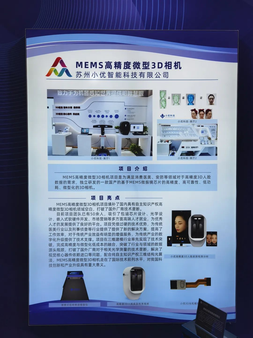 小優(yōu)智能科技攜自主研發(fā)的MEMS振鏡芯片、3D光機模組、MEMS高精度微型3D相機、高精度3D人臉檢測系統(tǒng)、便攜式現(xiàn)場痕跡提取儀等產(chǎn)品參展。并在展會活動現(xiàn)場向各級領導、來展人員詳細介紹了公司發(fā)展歷程、最新研發(fā)的高精度3D相機產(chǎn)品優(yōu)勢,并進行了高精度3D人臉檢測效果演示。